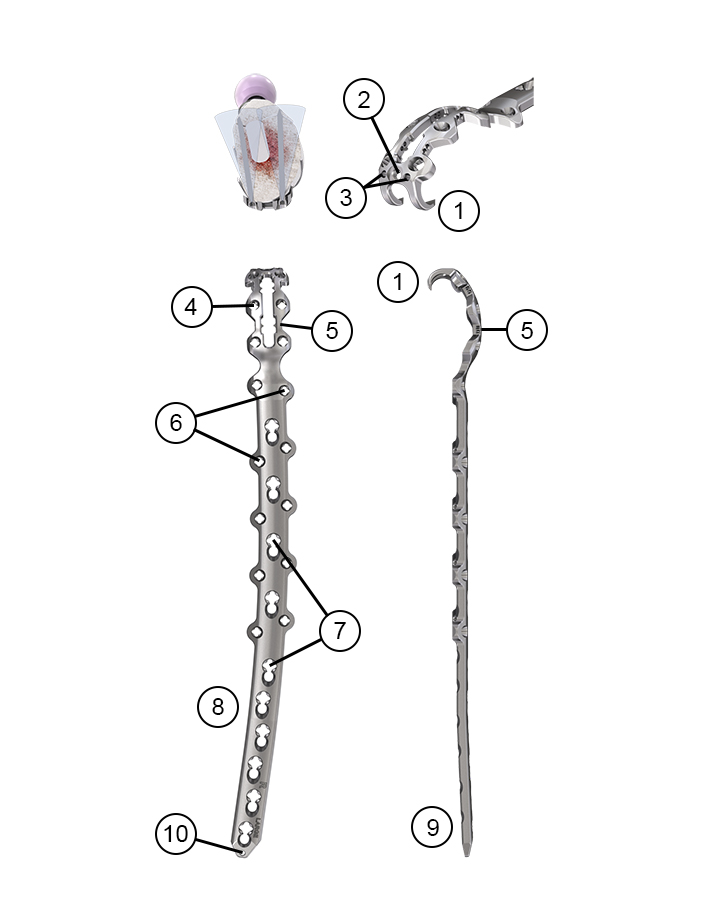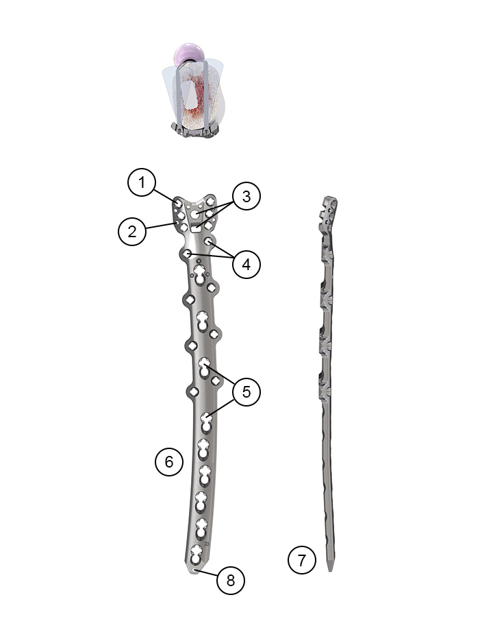 (7) Distal flare to fit the distal femoral anatomy (for 9-hole and longer plates).