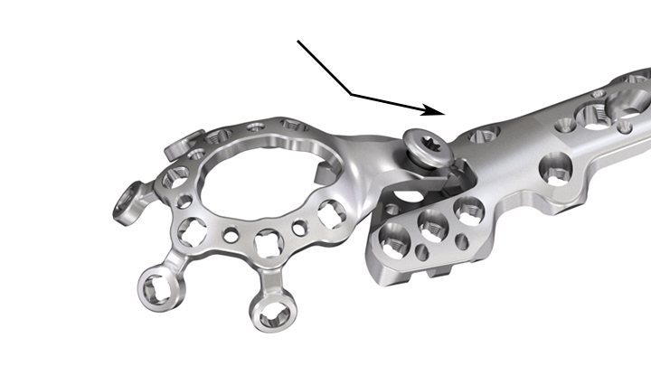 (8) Distal plate tip with wire hole and slot for Articulated Tension Device.