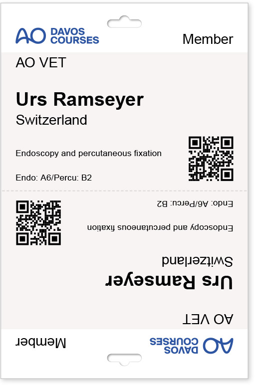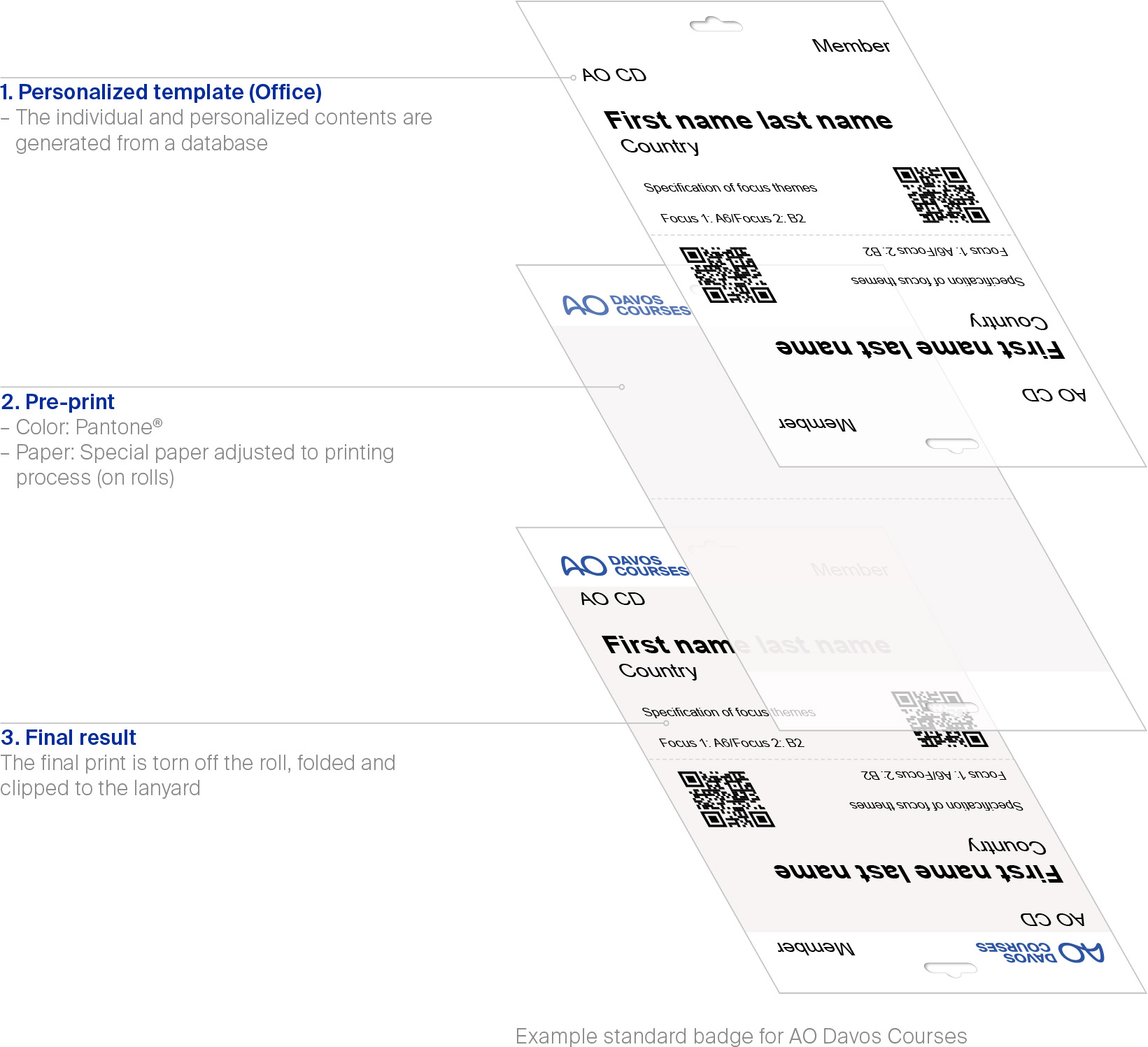 Badges are produced individually for all types of courses and seminars. Most badges are used within the AO Davos Courses and have the appropriate sender. These badges are produced in a two-step workflow: A high-quality pre-print with a template generated from a database.
