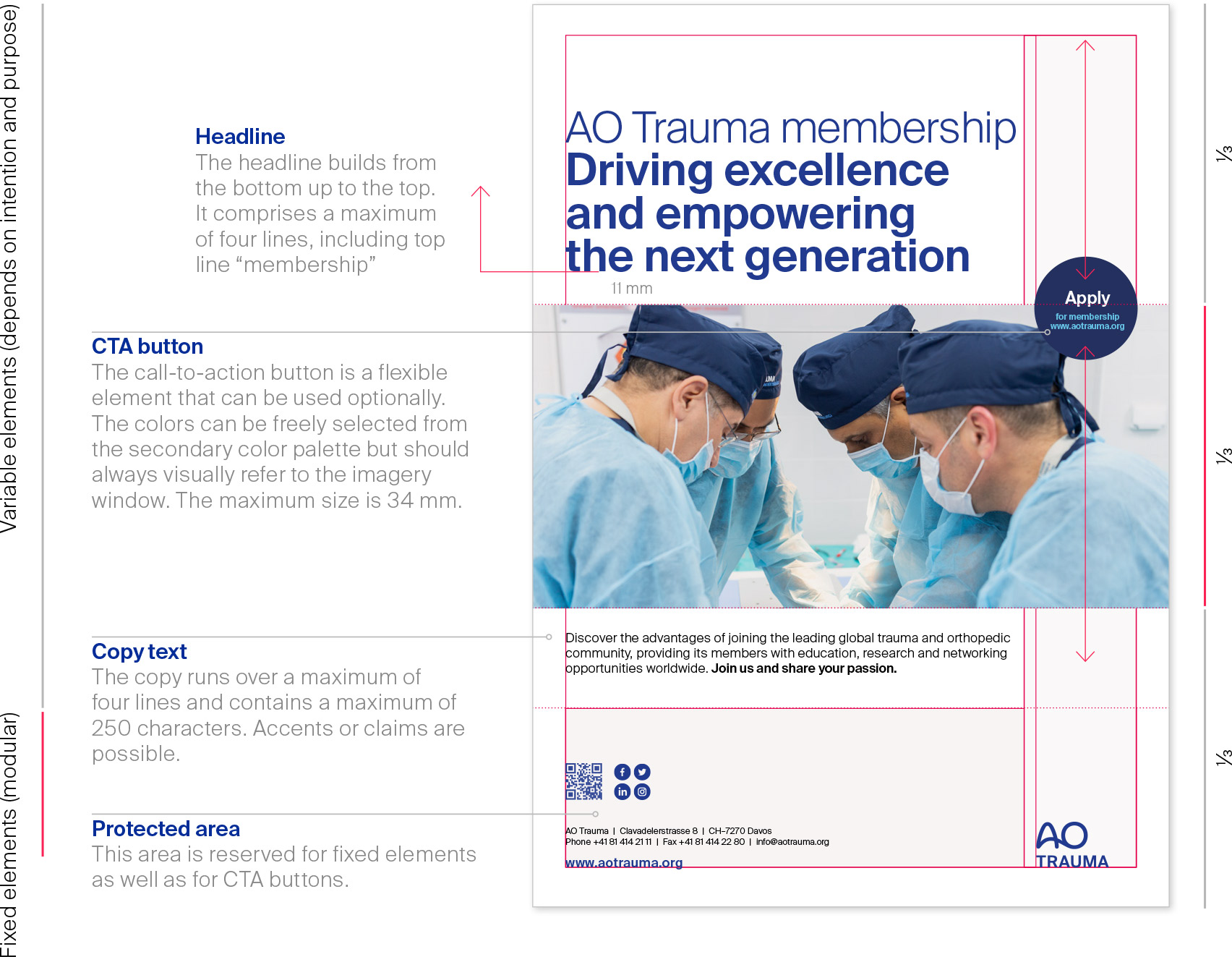 The alternative promotion ads for events such as courses and seminars are based on the same primary grid as the membership ads, using the same typographical principles and the AO color range.