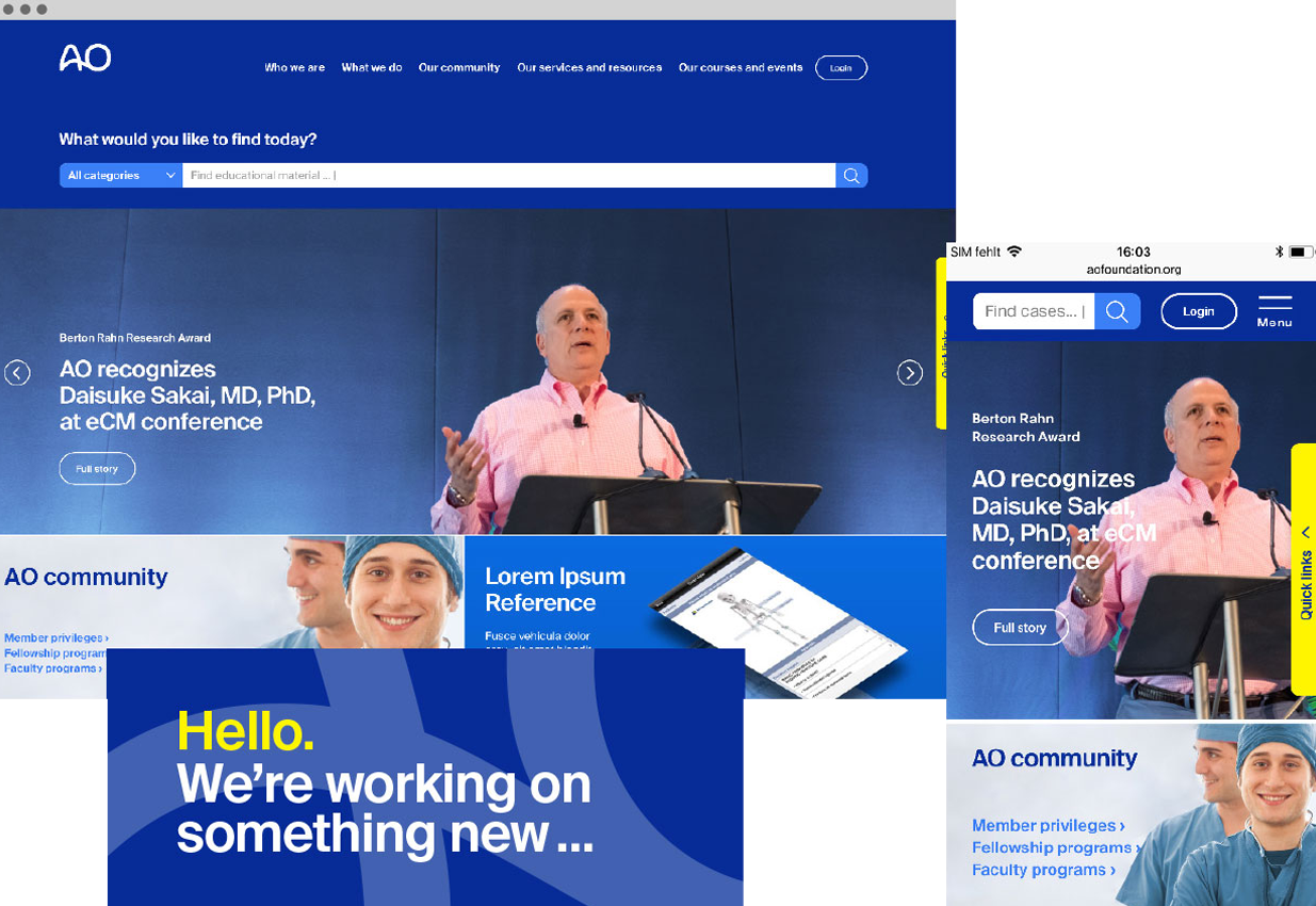 AO blue is the main application color and is used in the color area, in the logo and in the typography, as well as in graphic forms such as icons. Together with white, this combination accounts for 80 percent of the overall impression.