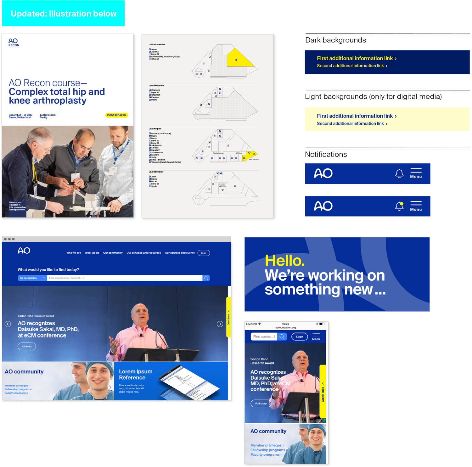 AO yellow is used as a color accent to highlight actions and important information. Its use should be kept to the minimum in any medium. Yellow is used sparingly, with caution. The maximum use of AO yellow is five percent.