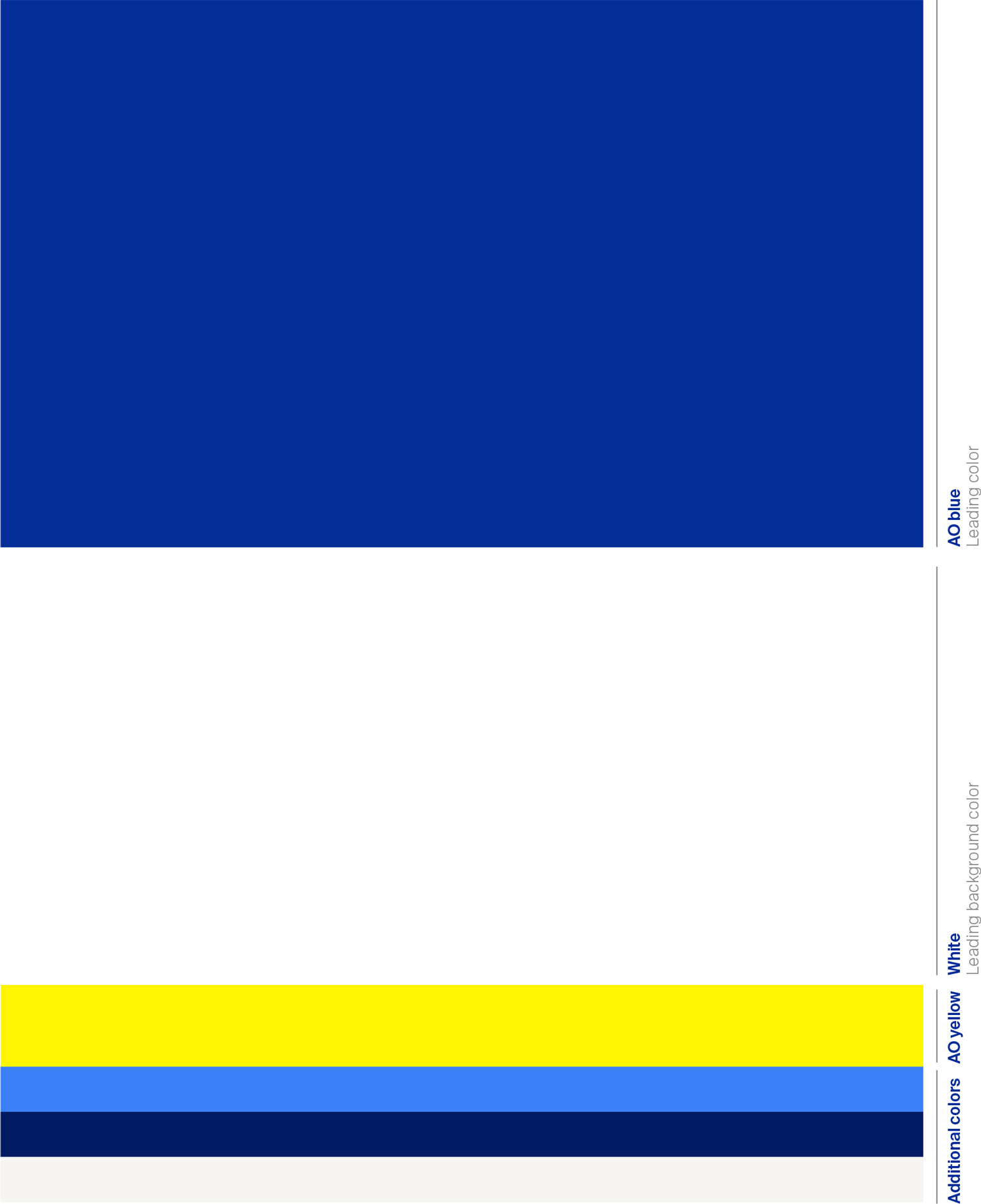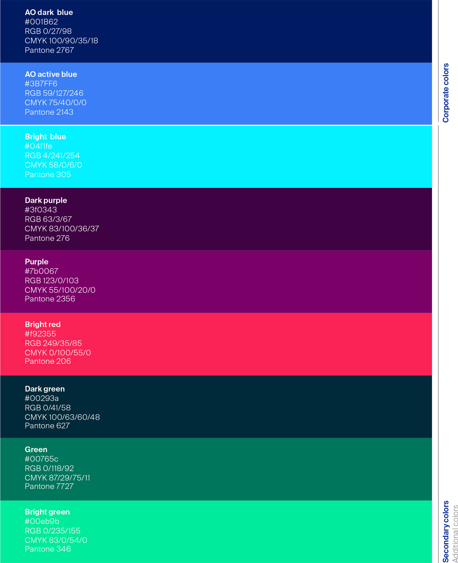 For the sake of completeness and to show the concept in its full spectrum, AO active blue and AO dark blue are also shown. These are, of course, primary colors of the AO brand.