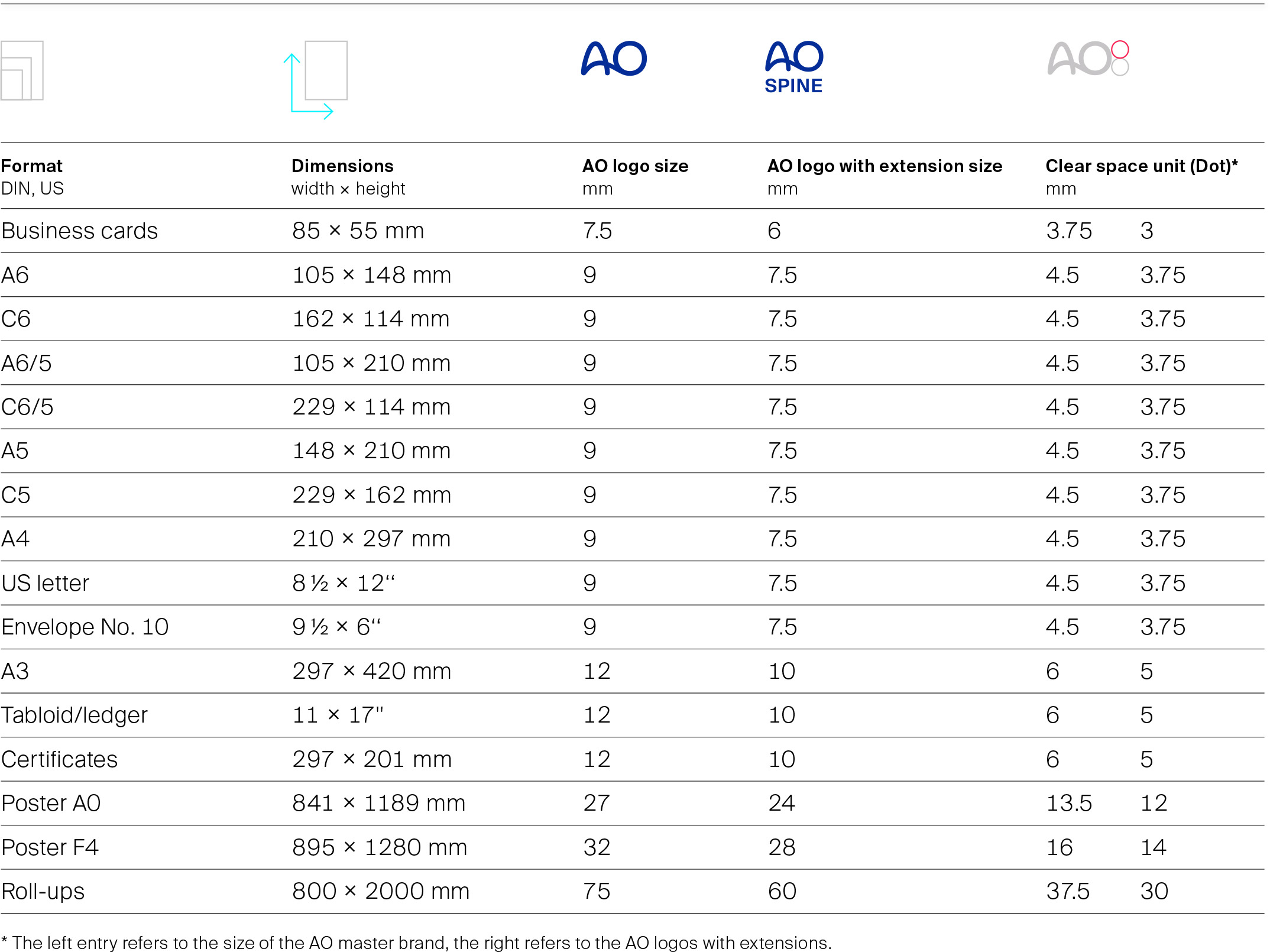 Please note: For optical reasons, the AO master brand is always placed slightly larger than the brands with extension. The exact sizes per medium can be found in the list.