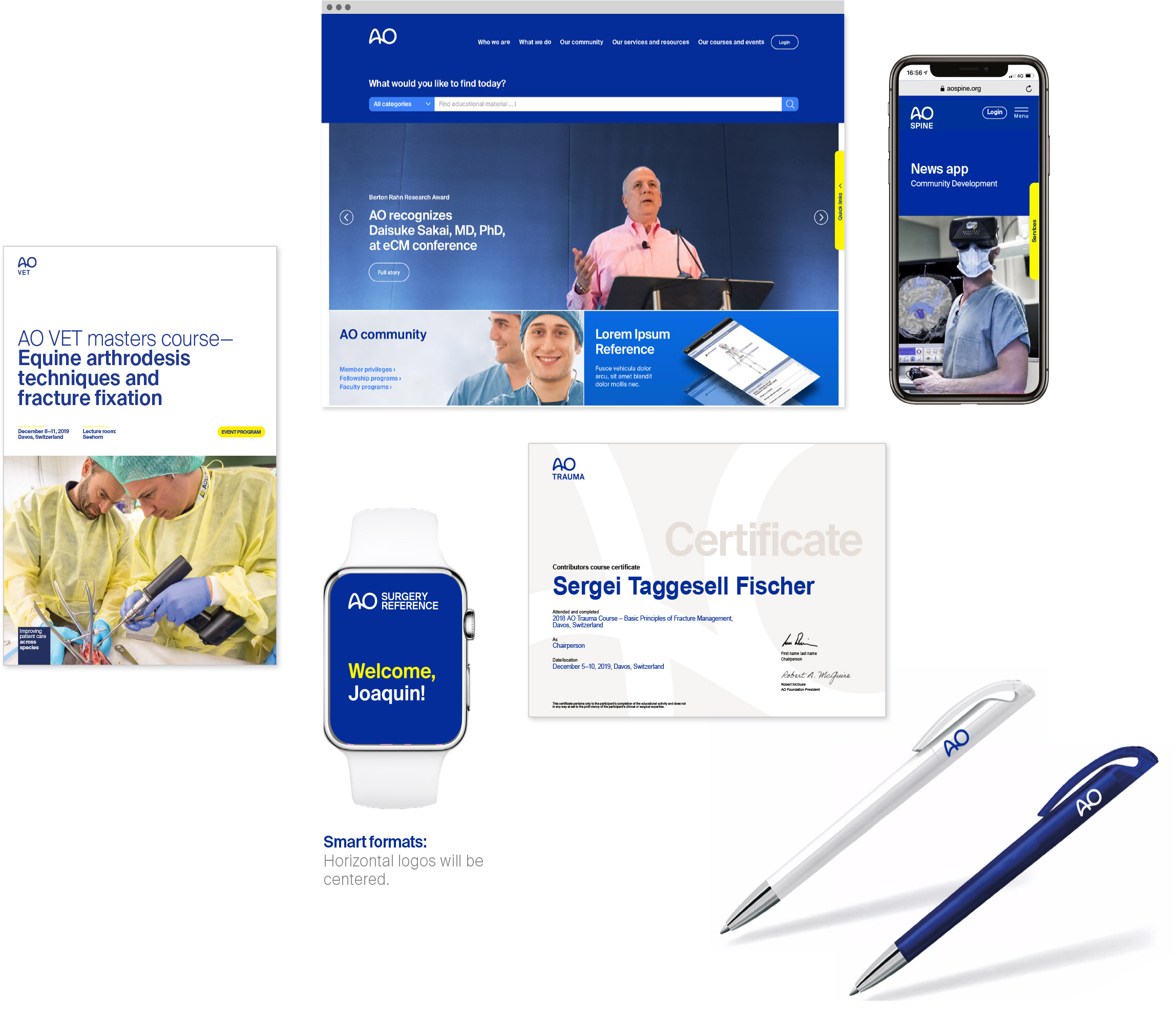 The AO logo comes in four colors: blue, white, black, and gray (in selected applications). Wherever possible, use the official AO blue tone.