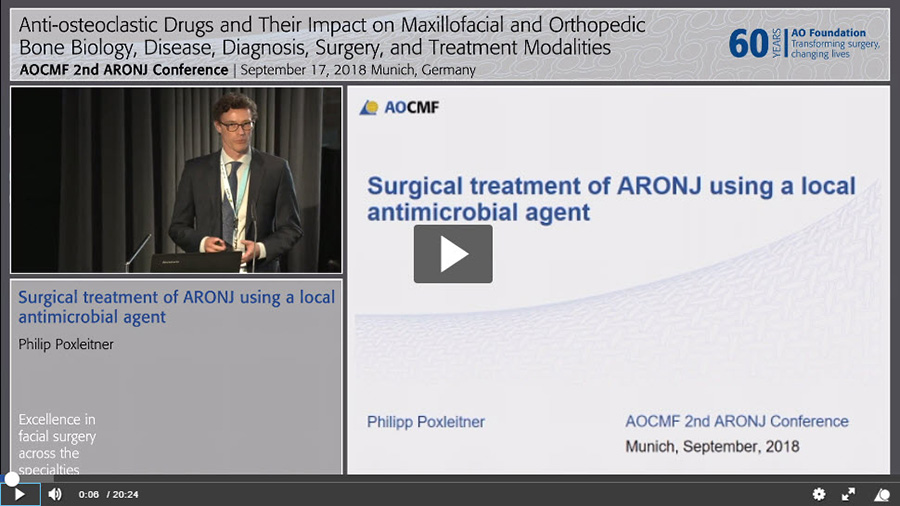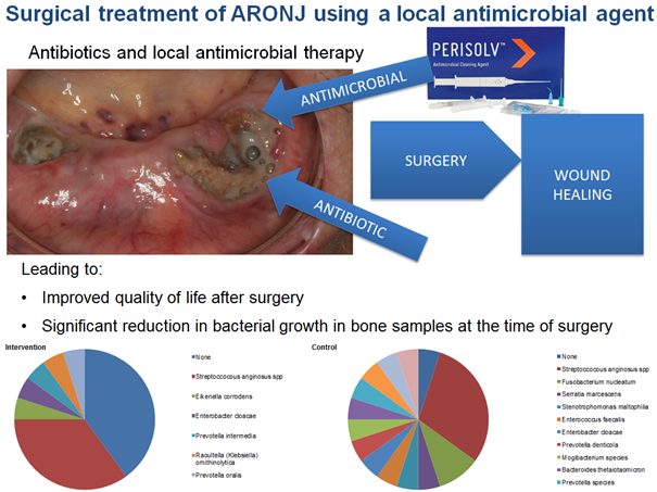 AO CMF-16-12P Project title: Surgical treatment of ARONJ using a local antimicrobial agentAntiresorptive related osteonecrosis of the jaw (ARONJ) has become a frequent complication in oral- and maxillofacial hospitals. Due to aging of society the indications for the use of bone-modifying agents rise. Therefore the incidence of ARONJ is rising despite increasing awareness and prophylactic measures. The clinical management of osteonecrosis is still challenging since conservative treatment leads to complete healing in only 0-62%, whereas early surgical debridement of affected bone and a throughout soft tissue closure is successful in 86-95%. In the pathogenesis of ARONJ pH value and infections plays an important part and the influence of a local disinfecting agent in the area of the necrosis is to be investigated. Perisolv was initially developed for the treatment of periodontal disease as a local active agent to reduce bacterial load during scaling and root planning. It contains Natriumhypochloride that has antibacterial and antifungal properties and a long history in dental practice. It leads to a rise in local pH value and degradation of biofilm, destruction of toxins and anti-inflammatory activities. In the presented study we want to investigate the effect of local application of a new antimicrobial agent on antiresorptive related osteonecrosis of the jaws. In a prospective study 40 patients with ARONJ stage II and up will be included and randomly assigned in two groups. Local administration of Perisolv will be performed on two days preoperatively on the necrotic lesions in the intervention group. Following perioperative antibiotic treatment, the intervention group will undergo surgery and necrosis will be surgically and fluorescence-guided removed with plastic wound closure. The control group will also undergo surgery including debridement of necrotic bone and plastic wound closure but no administration of a local disinfecting agent will be performed. Primary endpoint will be complete wound closure at clinical evaluation at follow-ups after two weeks, one, three, and six months and after one year. Other endpoints will be the systemic inflammatory parameters including white blood cell count, C-reactive protein and Procalcitonin at different time points. In addition, the local bisphosphonate and antibiotic concentration will be measured by using chromatography-tandem mass spectrometry from the necrotic bone tissue harvested at the time of surgery. Pre- and post-operative MRI will be used to evaluate the extent of the lesion and the healing process.