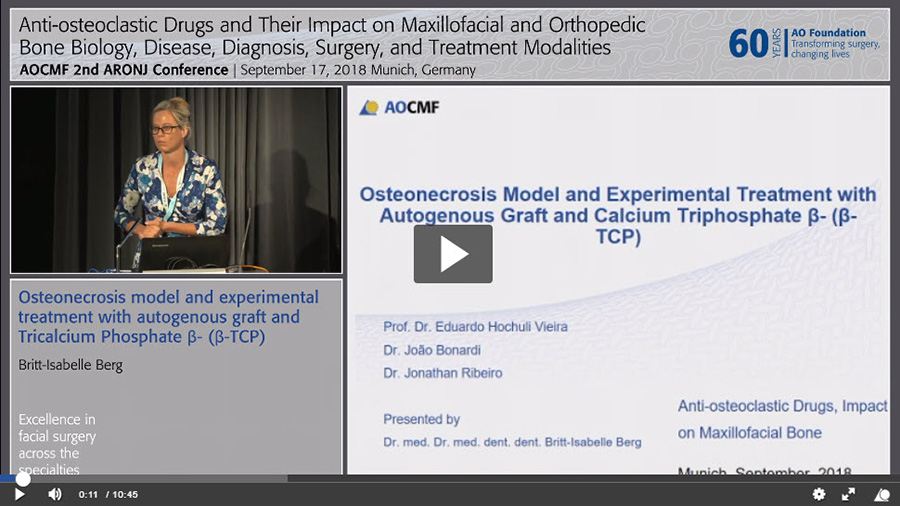 AO CMF-16-02H Project title: Osteonecrosis model and experimental treatment with autogenous graft and calcium triphosphate β- (β-TCP)Osteonecrosis is one of the side effects associated with the use of bisphosphonates. It is a clinical condition characterized by bone necrosis resulting from systemic and local factors that compromise bone vascularization. Such drugs are able to modify the bone remodeling, raising questions about the influence of the drug in clinical procedures in maxillofacial surgery, due to excessive suppression of bone repair. Objective: The purpose of this study was to assess bone formation in rats with osteonecrosis induced by bisphosphonate in the region where a dental extraction was performed and filled with autogenous bone graft and β- calcium triphosphate (β-TCP).