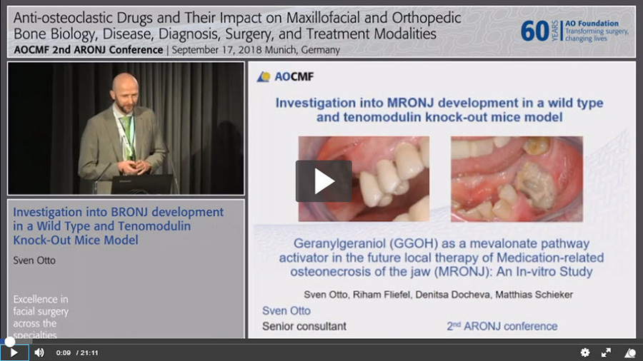 Doi: 10.1016/j.jcms.2016.05.018Wissenschaftspreis DGMKG 2015 - S. Otto, M. Troeltzsch, F. Probst, E. Burian, O. Ristow, D. Arens, D. Nehrbass, M. Stoddart, C. Pautke, M. Ehrenfeld (2016): Von der Zellkultur über das Grosstiermodell zur Optimierung der klinischen Prophylaxe und Therapie medikamenten-assoziierter Kiefernekrosen. Doi: 10.1007/s12285-016-0067-0