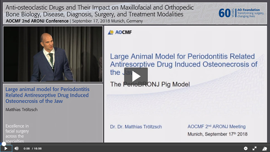 AO CMF-16-15T Project title: Large animal model for periodontitis related antiresorptive drug induced osteonecrosis of the jawAntiresorptive drugs for the treatment of osteoporosis and metastatic bone disease are widely used. An important adverse effect is antiresorptive drug induced osteonecrosis of the jaw (ARONJ). If diagnosis or treatment is delayed ARONJ can cause severe complications. Pathomechanism theories of ARONJ include over-suppression of bone turnover, anti-angiogenetic effects or soft-tissue toxicity but cannot answer all questions associated with ARONJ. A novel pathomechanism discusses local infections and acidification as crucial steps of ARONJ etiology (1, 2) that can impede osteoclastic activity.