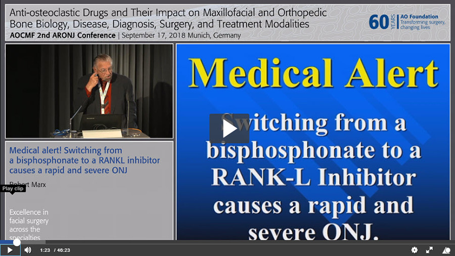 Bisphosphonates and Denosumab are the most widely used classes of antiresorptive drugs for the treatment of osteoporosis and metastatic bone disease. An important adverse effect is antiresorptive drug induced osteonecrosis of the jaw (ARONJ). Bisphosphonate-related osteonecrosis of the jaw (BRONJ) mainly occurs in cancer patients receiving intravenous administrations of nitrogen-containing bisphosphonates (1). Current research has identified sustained therapy with Denosumab (an antibody against RANK–ligand) as a risk factor for the development of ONJ (2). Denosumab related ONJ (DRONJ) occurs at a similar rate as BRONJ (3-5). If diagnosis or treatment is delayed, ARONJ can develop to a devastating disease. The pathomechanisms of ARONJ are not completely understood. Current theories include over-suppression of bone turnover, anti-angiogenetic effects or soft-tissue toxicity but cannot answer all questions associated with ARONJ. A novel potential pathomechanism discusses local infections and acidification as crucial steps of BRONJ etiology (1, 6). Local Infections might play a key role in the pathogenesis of ARONJ because especially then the activity of osteoclasts is mandatory but severely suppressed due to the activity of antiresorptive drugs.
