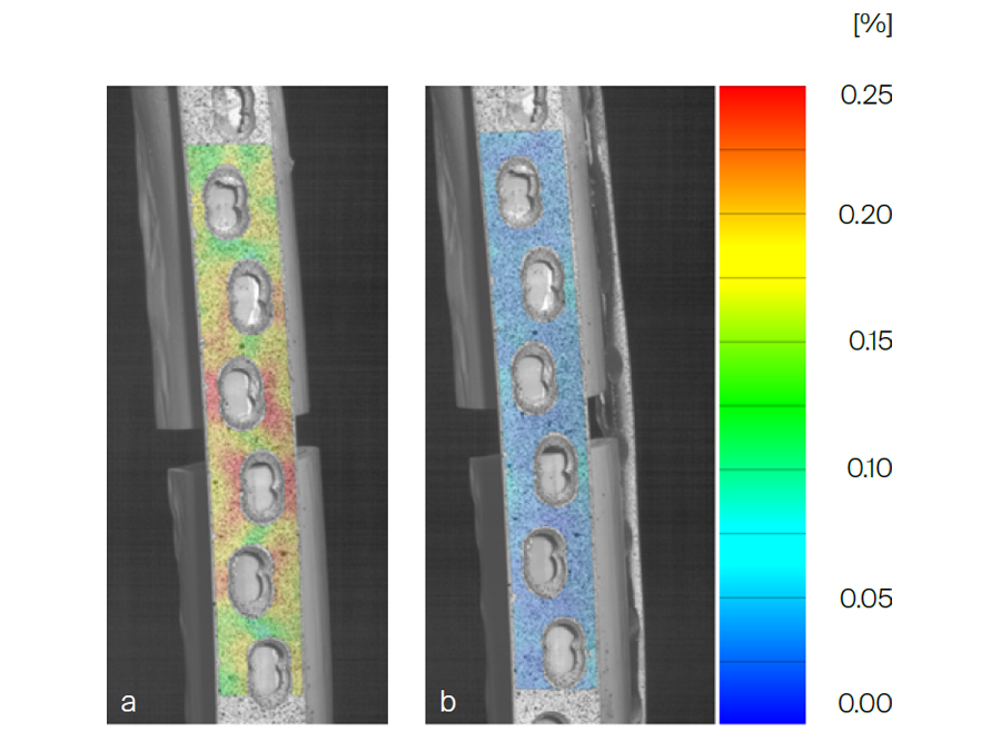 Constructs with both lateral and helical plates demonstrated similar axial and torsional stiffness, independent of the contact or gap situations, being significantly higher compared with lateral plating (P <.01). Torsional stiffness of the constructs, with both lateral and helical plates in the gap situation, was significantly higher compared with this situation stabilized by a nail (P < .01). Plate surface strain dropp ed from 0.3% in the gap situation with a lateral plate to < 0.1% in this situation with both a lateral and a helical plate (Fig 2).