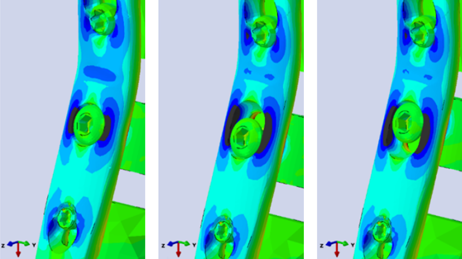 Single-plate fixation bridging bone defects provokes nonunion and risks plate-fatigue failure due to under dimensioned implants. Adding a helical plate to bridge the fracture increases stiffness and balances load sharing (Fig 1). The aim of this project was to compare stiffness and plate surface strain of different constructs in a transverse contact and gap femoral shaft fracture model.