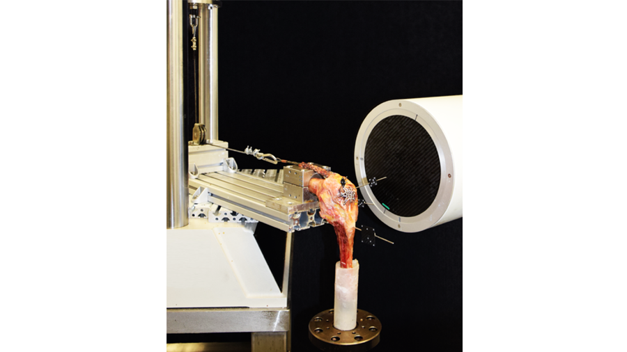 Sixteen pairs of human anatomical knee specimens were used to simulate either two-part transverse simple AO/OTA 34-C1 or five-part complex AO/OTA 34-C3 patella fractures by means of osteotomies, with each fracture model being created in eight pairs. The complex fracture pattern was characterized with a medial and a lateral proximal fragment, together with an inferomedial, an inferolateral, and an inferior fragment mimicking comminution around the distal patellar pole. The specimens with simple fractures were pairwise assigned for fixation with either tension band wiring through two parallel cannulated screws, or an anterior variable angle locking core plate. The knees with complex fractures were pairwise treated with either tension band wiring through two parallel cannulated screws plus circumferential cerclage wiring, or an anterior variable angle locking three-hole plate. Each specimen was tested over 5000 cycles by pulling on the quadriceps tendon, simulating active knee extension and passive knee flexion within the range from 90° flexion to full knee extension. Interfragmentary movements were captured by means of motion tracking (Fig 2).