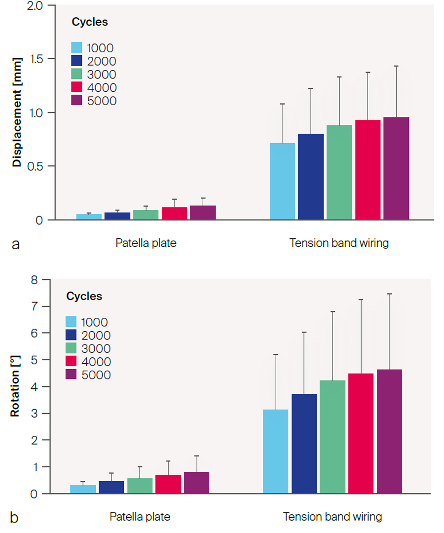 For both fracture types, the articular displacements, measured between the proximal and distal fragments at the central aspect of the patella between 1000 and 5000 cycles, together with the relative rotations of these fragments around the mediolateral axis were all significantly smaller following the anterior variable angle locked plating compared with the tension band wiring, P < .01 (Fig 3).