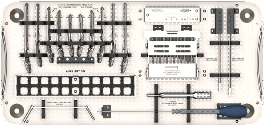 New VA-LCP Lateral Distal Fibula Plates in titanium and associated anatomic tray for the Universal Small Fragment System