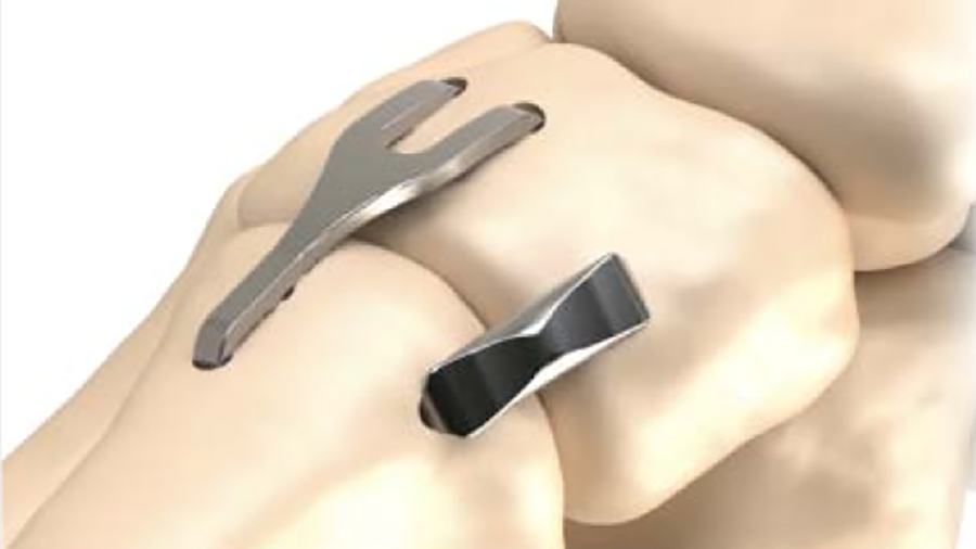 The DPS Hammertoe CCI has a staple-like design with four legs and a low profile connecting bridge (Fig 1). It is made of biocompatible Nitinol, a metal alloy of nickel and titanium, which is known for its superelastic properties and shape memory behavior.