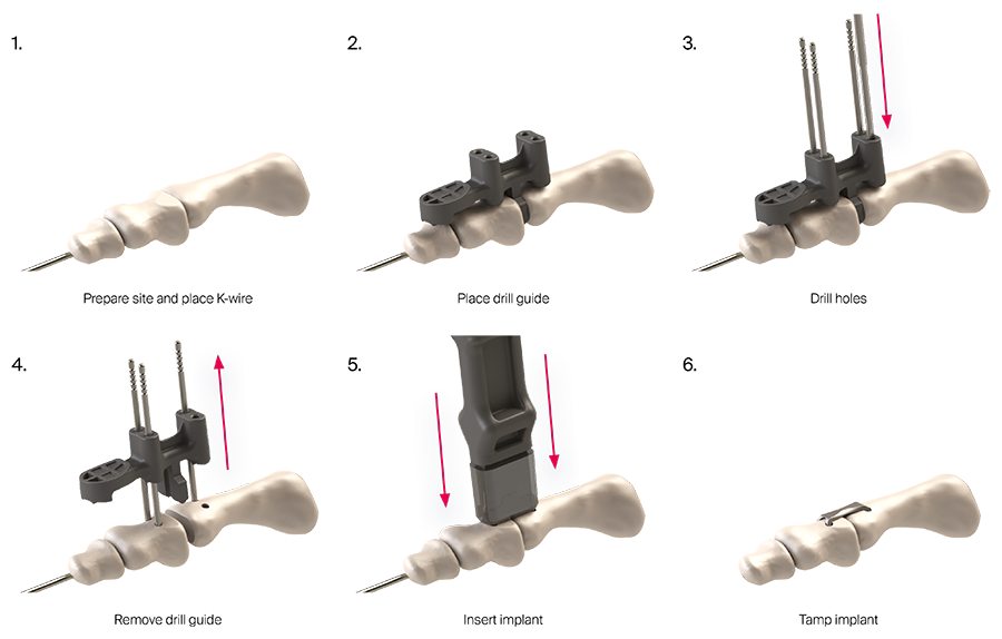 Hammertoe deformities are one of the most frequent deformities treated by foot and ankle surgeons. In rigid and structured hammertoe deformities not suited for nonoperative management, arthrodesis of the proximal interphalangeal (PIP) joint represents the standard treatment. Temporary K-wire fixation is the most frequently used, low-cost fixation method for PIP joint fusion. However, reported complications associated with K-wires have prompted the development of new implants over the past decade. To address weaknesses of intramedullary fixation concepts (eg, limited rotational stability), the Foot and Ankle Expert Group approved the first extramedullary continuous compression implant (CCI) to treat hammertoe deformities – the DePuy Synthes Hammertoe Continuous Compression Implant (DPS Hammertoe CCI).
