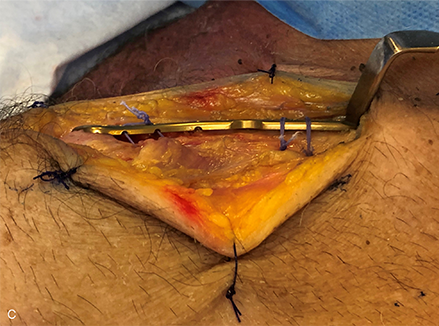 Figure 1a–c Distal clavicular fixation during prototype evaluation of the novel VA Clavicle System. Lateral is to the left in all figures. Conformation of the plate to the superior topography of the distal clavicle is designed to facilitate positioning of the distal margin of the plate parallel to the acromioclavicular joint (a) and respects the almost universal 12o downward tilt of the distal clavicle in the lateral fifth of the bone (b), while also allowing the plate to follow the beginning of the twist region at the junction of the second and third fifths of the bone (c).