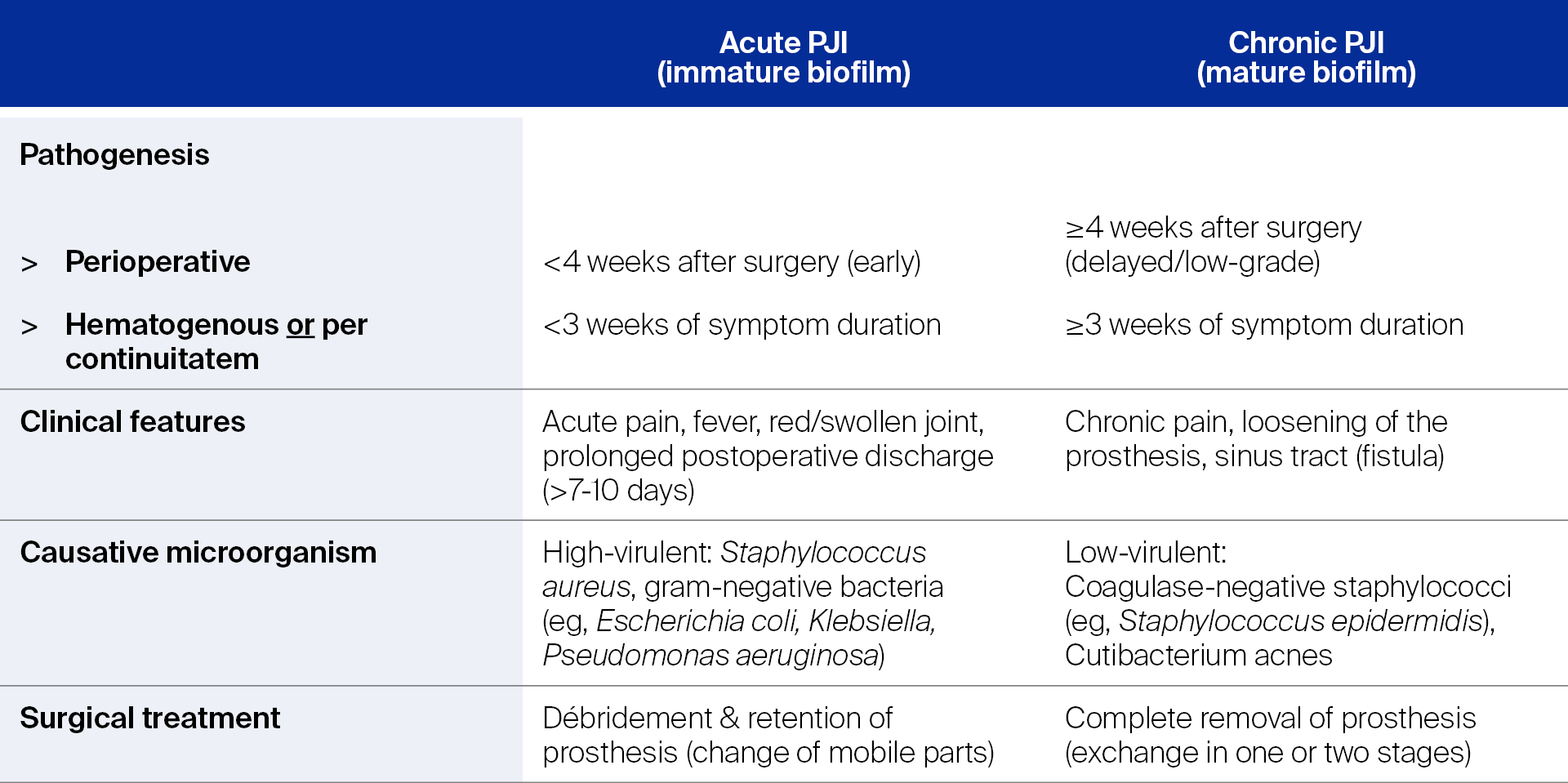 How should a clinician tackle the management and treatment of a periprosthetic joint infection (PJI)? An individualized approach must be developed for each patient, one that integrates appropriate surgical intervention and antimicrobial strategies. The complexities of treating a biofilm infection calls for careful consideration of each case, addressing the acute or chronic nature of infection.