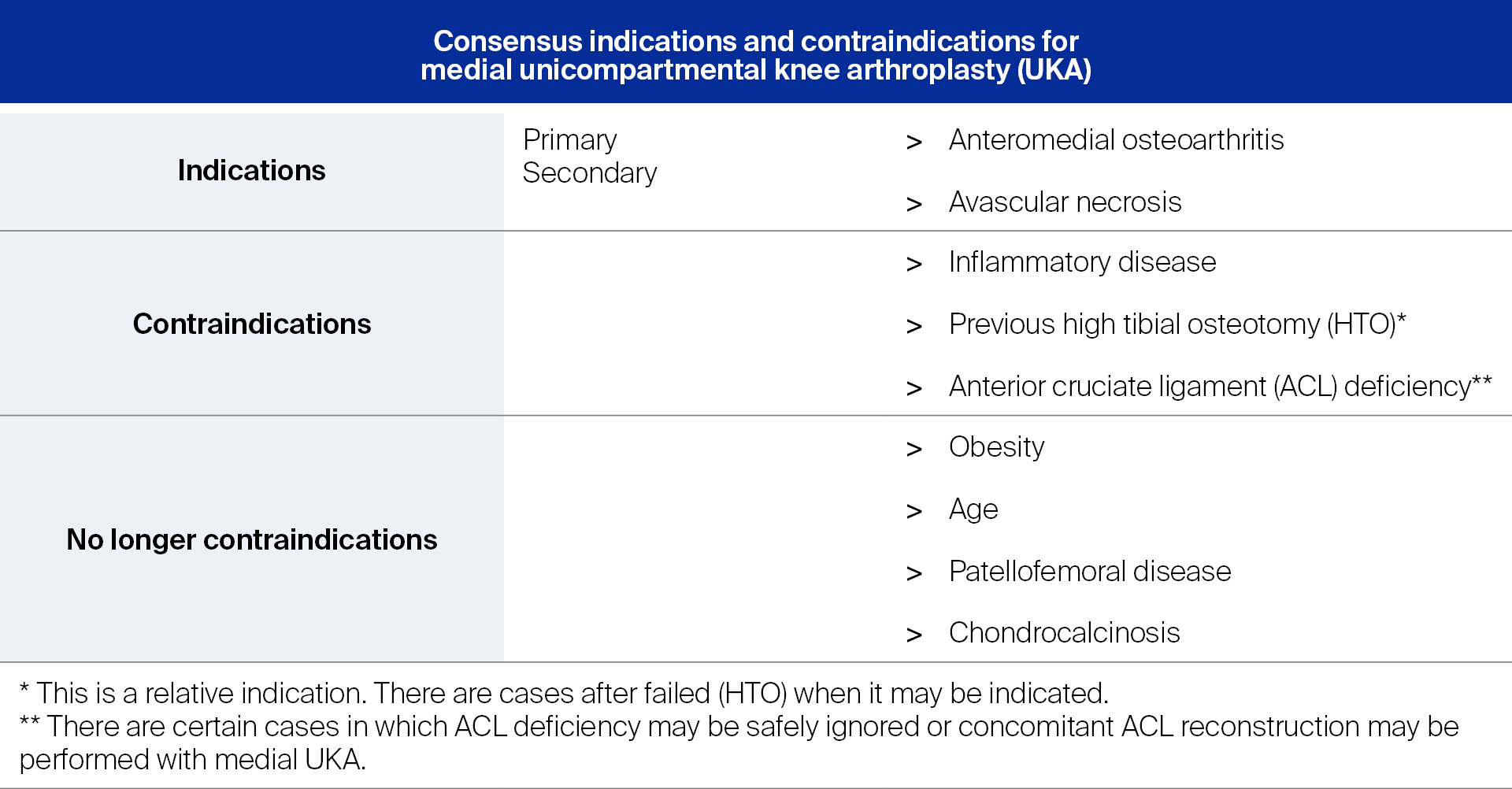 In 2015, six surgeons with combined experience of 8,000 UKAs (representing between 10% to 50% of their primary knee practices) published a consensus statement in the Journal of Surgical Orthopedic Advances on the indications and contraindications for medial UKA (see Table 1).