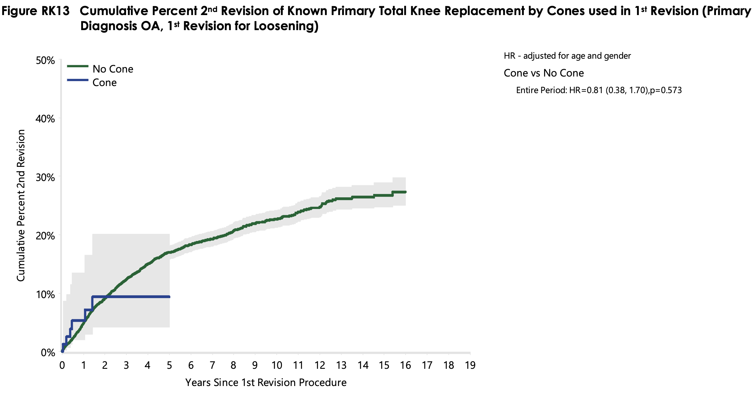 Large national joint arthroplasty registries in the UK and Australia report that the 10-year prosthetic survival rates of TKA revision surgery are around 20% [1, 2]. Nevertheless, the detailed analysis of survival rates is complex because the risk factors are manifold, and the use of sleeves and cones is just one of many variables. The National Joint Registry (NJR) of England, Wales, Northern Ireland, the Isle of Man, and the States of Guernsey [1] identified the time after primary knee replacement, type of primary fixation, type of revision prosthesis, as well as the indication for revision, as risk factors for re-revision. The Australian Orthopaedic Association National Joint Replacement Registry (AOANJRR) [2] identified diagnosis, components revised, gender, age, ASA score, as well as severe obesity, as risk factors. Additionally, they analyzed the effect on re-revision rates when supplementary implants, such as stem extensions, sleeves, or cones were used. Using stem extensions or sleeves (Figure 1) resulted in improved survival rates. No such difference was observed with cones (Figure 2). However, the low number of cones in the analysis is a major limitation to this data analysis: only 79 cones were included in the beginning, and this number dropped to 23 after 3 years, and 11 cones after 5 years. Note that these analyses did not factor in the type of bone defect present at the time of surgery, as this data was not available.