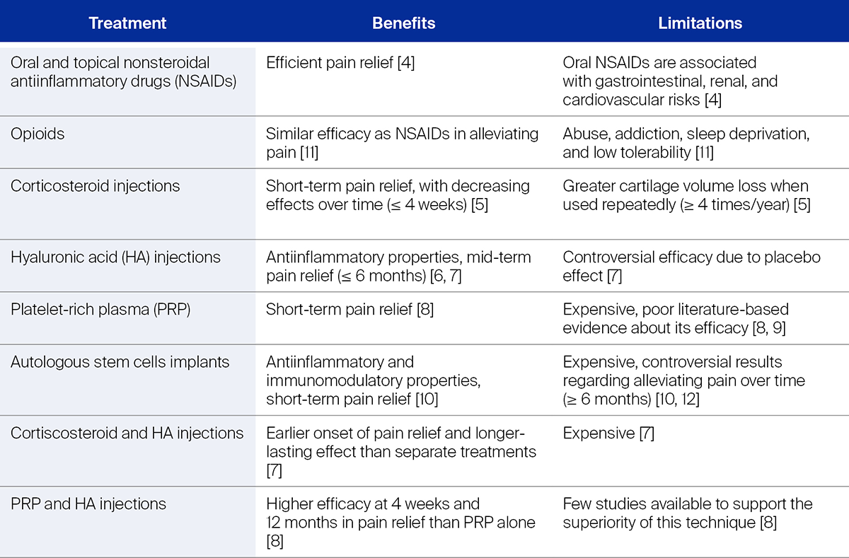 As with any patient presenting with knee pain from OA, the first-line approach in managing patients with PTOA is nonoperative. The mainstays of nonoperative management consist of activity modification, weight loss, nonsteroidal antiinflammatory drugs (NSAIDs), and acetaminophen [4]. Intraarticular injections of corticosteroid or viscosupplementation are also options [5, 6]; however, there is increasing evidence of the low cost-effectiveness of viscosupplementation for the treatment of end-stage knee OA [7]. Injections of stem cells and platelet-rich plasma (PRP) is currently in the experimental phase for the treatment of OA and is not generally recommended outside of well-designed research studies [8-10]. Further details about the benefits and limitations of these treatments are displayed in Table 1. When patients have tried many of these modalities but are still having significant pain and dysfunction that considerably affects their quality of life and daily activities, knee arthroplasty is an option.