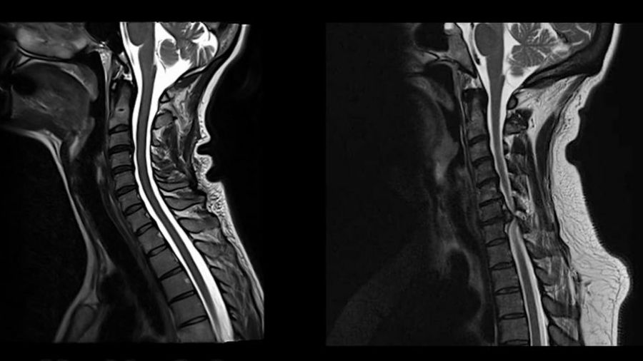 In a second case, a patient who had previously undergone DCM surgery (10 years ago) presented with significantly worsening functional impairment and recurrent falls. This patient had deteriorated over the last six months to the point where he was mostly bed-bound, incontinent of urine and unable to use his hands to open containers or manipulate a fork or knife. Emergency medical technicians were called three to four times per week to lift him back into his bed after falling. Similar to the first case, his medical history and physical examination were consistent with myelopathy, and an MRI of his cervical spine showed severe cord compression with diffuse signal change. Both of these cases were taken to the operating room for emergency surgical decompression of the cervical spine.