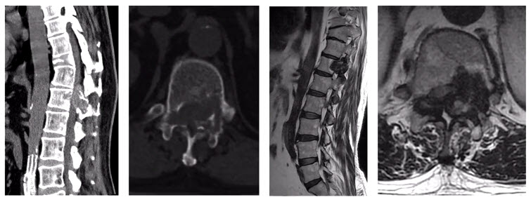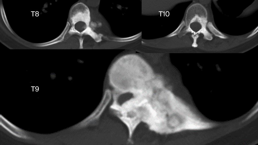 But sometimes things are more complicated. Another case involved a 33-year-old female. The chest X-ray examination found an osteogenic spinal lesion. The CT scan showed osteolytic lesions of T9 left vertebral body, facet joints and rib, with extensive reactive bone formation.