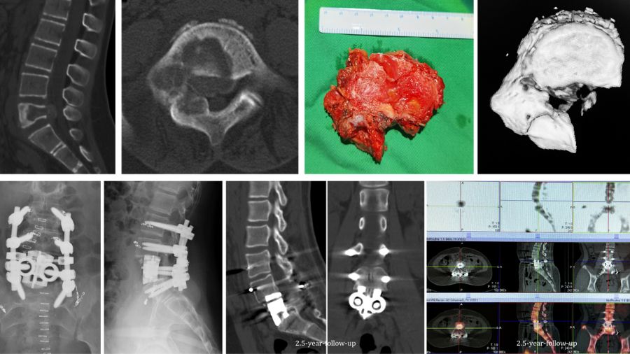 Let’s consider another case. It was a 55-year-old male presenting with incomplete paralyzed, Frankel C. Osteoblastoma of T12 was diagnosed by biopsy. It was Enneking stage 3 lesion. We did an intentional intralesional en bloc spondylectomy, then radiotherapy after the surgery. There was no recurrence in the two-year follow-up.