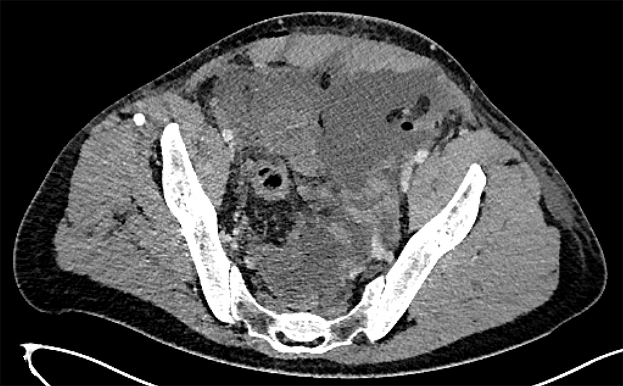 On postoperative day 12 after the ALIF procedure, the patient was discharged with no symptoms—no pain, no fever, and normal micturition and biology. But on day 20 after the ALIF procedure, the patient again came back to the ER because of suspect ted leakage through the abdominal cutaneous scar.