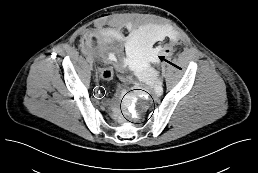 The first diagnosis was an intestinal occlusion secondary to the intraoperative site collection. Consequently—and after gastrointestinal surgery consult—a nasogastric tube was inserted. But the pain persisted on the following day, and his kidney function was deteriorating with an estimated glomerular filtration rate decreased from 100 to 60 ml/min.