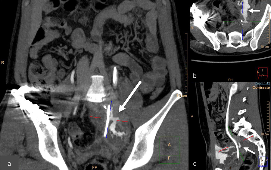 The uroscanner confirmed a left distal ureteral punctiform injury, detecting a filiform leakage (Fig. 2).