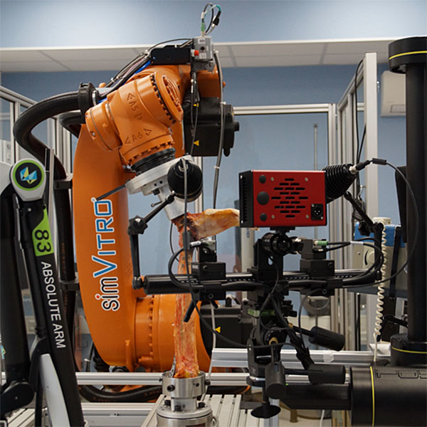 In der geplanten Studie soll nun die Bewegung der Fibula zur Tibia hin in einem bereits in Vorversuchen entwickeltem Projektaufbau an einem 6-Achsen-Industrieroboter unter kontinuierlicher Belastung und Bewegung schrittweise unter Durchtrennung und Rekonstruktion der Syndesmosenregion untersucht werden (Siehe Abbildung 1). Hierbei wird zunächst ein hinteres Kantenfragment osteotomiert sowie im Folgeschritt eine ligamentäre Durchtrennung des vorderen und interossären Syndesmosenblattes präpariert. Im dritten Schritt wird das hintere Kantenfragment durch eine Plattenosteosynthese rekonstruiert. Gegenübergestellt werden in weiteren Versuchsschritten dann die additive Augmentation des vorderen Syndesmosenblattes mit einem SutureTape Fadenanker im Vergleich zur fibulotibialen Stellschraube sowie die Kombination aus beiden Verfahren bis hin zum Load to Failure Test (Siehe Abbildung 2). Ziele der Studie sind zum einen die Untersuchung der Kinematik der Fibula im physiologischen, instabilen sowie dorsal rekonstruierten Zustand, da erste Ergebnisse auf eine persistierende Rotations- und Sagittalinstabilität der Fibula nach Osteosynthese des hinteren Kantenfragmentes hindeuten. Zum anderen soll die Biomechanik und Stabilität einer neuartigen additiven anatomischen Rekonstruktion des vorderen Syndesmosenblattes im Vergleich zur konventionellen Stellschraube untersucht werden. Unsere Hypothese ist folgende: Die OSG-Kinematik wird durch eine Augmentation des vorderen Syndesmosenblattes mit einem anatomisch verlaufenden Fadenanker im Vergleich zur extraanatomischen Stellschraube physiologischer wiederhergestellt.