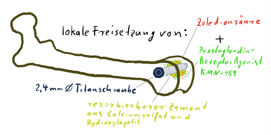 In Vorstudien zeigten sowohl Prostaglandinrezeptor-Agonisten als auch Bisphosphonate bei systemischer Anwendung, dass sie, insbesondere in Kombination, die Knochendichte von osteoporotischem Knochen erhöhen können. Die systemische Behandlung mit Prostaglandinrezeptor-Agonisten ist allerdings mit erheblichen unerwünschten Nebenwirkungen assoziiert. Es soll daher in der nun von der AO Trauma Deutschland geförderten Studie versucht werden, durch eine lokale Anwendung diese Nebenwirkungen wesentlich abzuschwächen und den Knochen lokal zu stärken.