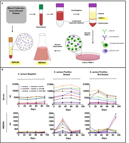 Figure: A diagnostic and prognostic immunoassay for the measurement of anti-S. aureus antibody levels in patients with osteomyelitis. (A) Schematic illustration of production of serum and isolation of MENSA from peripheral mononuclear cells of patients with osteomyelitis. (B) Anti-S. aureus antibody levels in serum and MENSA were determined using a custom bead-based multiantigen Luminex immunoassay developed by our group. Anti-S. aureus IgG responses was examined in serum and MENSA of diabetic foot infections (DFI) patients undergoing foot salvage antimicrobial therapy (FST). The change in antibody titers over the course of FST of a representative patient whose DFI was negative for S. aureus, a patient with S. aureus infection that responded to FST, and a patient with S. aureus DFI that failed FST are presented. Remarkably, MENSA levels faithfully reflected the S. aureus infection over time while serum levels remained unchanged.