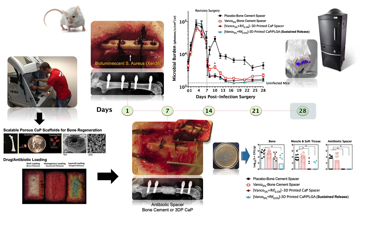 3. Adapt low-temperature 3-D printing of vancomycin- and rifampin-laden CaP scaffolds for sustained bactericidal delivery. This “next-generation” spacer technology with dual-antibiotic delivery significantly reduce bacterial burden and osteolytic bone loss of an established implant-associated bone infection as compared with vancomycin-laden PMMA, which is considered to be a clinical standard of care.