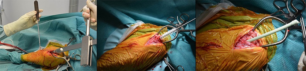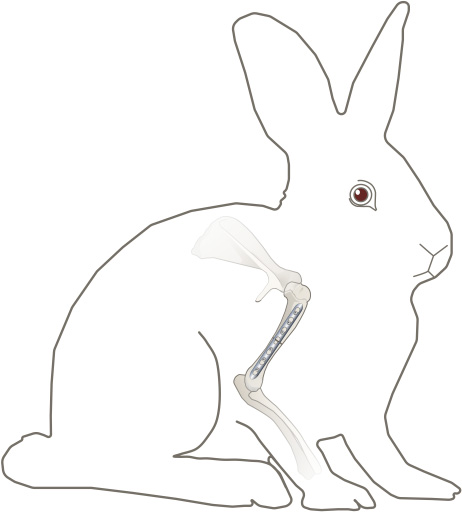 We use adult Swiss Alpine sheep, who receive a commercially available intramedullary nail in the tibia, fixed in place with a locking bolt. A localized inoculum of either a methicillin-sensitive or methicillin-resistant Staphylococcus aureus (MSSA, MRSA, respectively) is placed adjacent to the nail and a chronic infection is allowed to develop over 8 weeks. Treatment commences with implant removal, debridement and temporary placement of an antibiotic-loaded cement spacer (see figure). Antibiotics are delivered systemically intravenously for 6 weeks. A definitive fixation procedure involves further debridement and placement of a definitive intramedullary nail fixation. In this model, conventional treatment, as just described, achieves an approximate 50 percent treatment success rate, which closely mimics failure rates in humans with chronic MRSA infection.