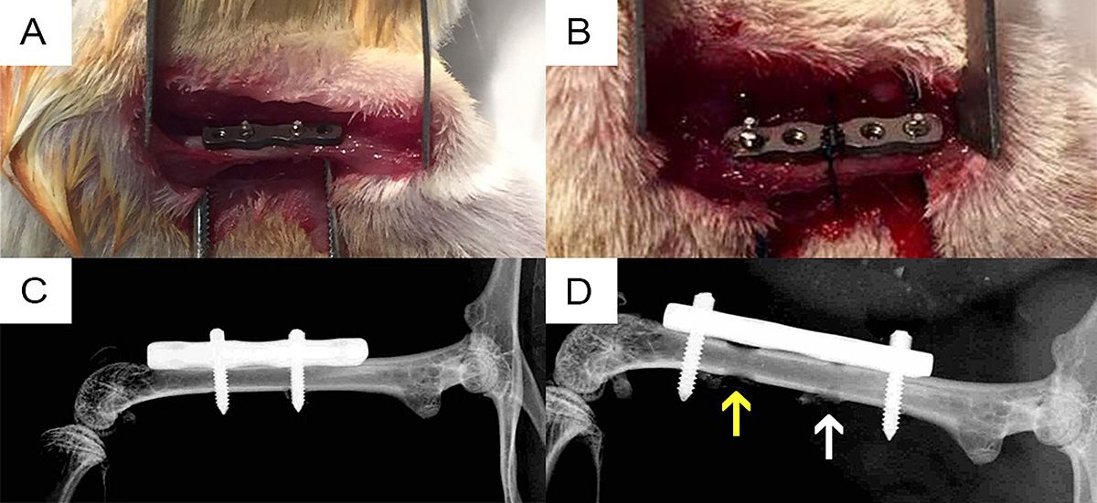 Figure: (A) Intraoperative photo of the RIS Mouse Fix Plate™ and internal screws prior to wound closure on day 0. (B) Intraoperative photo of the revised-implanted RIS Mouse Fix Plate™. (C) Postoperative day 0 X-ray of the RIS Mouse Fix Plate™ and internal screws, of which the distal screw was contaminated with 105 CFU of MRSA. (D) X-ray of the revised-implanted RIS Mouse Fix Plate™. Arrows indicate position of screws during the first surgery. Note that the hole of the contaminated screw (yellow arrow) is more profound than that of the sterile screw (white arrow) due to osteolysis.