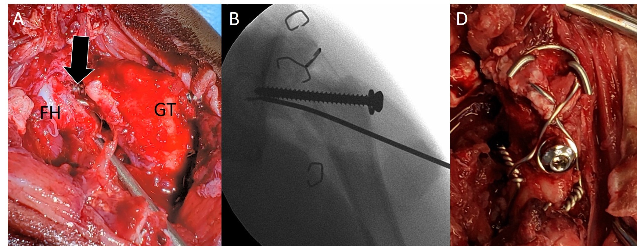 The treatment included placement of a screw with a washer and a pin to reestablish the femoral neck, and a tension band to secure the trochanter.