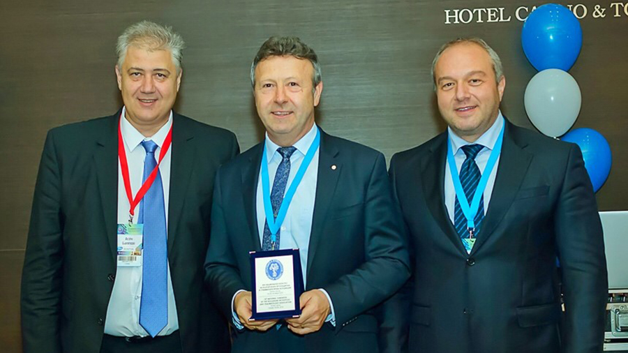 Bulgarian Orthopedic and Traumatology Association President Prof Asen Baltov (left) and Vice President Prof Kalin Mihov (right) hand over the Honorary Membership Award to Prof Boyko Gueorguiev (middle).
