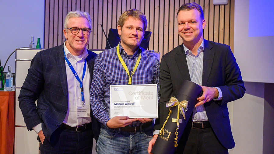 On December 7, 2019 at a meeting of the AO Technical Commission Chairs, Dr Markus Windolf was honored with the prestigious AO Technical Commission Certificate of Merit, recognizing the integral role he has played in driving AO innovations forward. Giving Markus the award, Prof Michael Raschke, Chair of the AO Technical Commission Trauma, noted the numerous significant contributions he has made over the years, specifically his work on a simplified navigation system based on shape recognition to improve orthopedic procedures, and on a concept that automatically determines the required screw length during bone drilling. Both these concepts sparked great interest among the AO Technical Commission's Expert Groups and are currently in translation to clinical application.