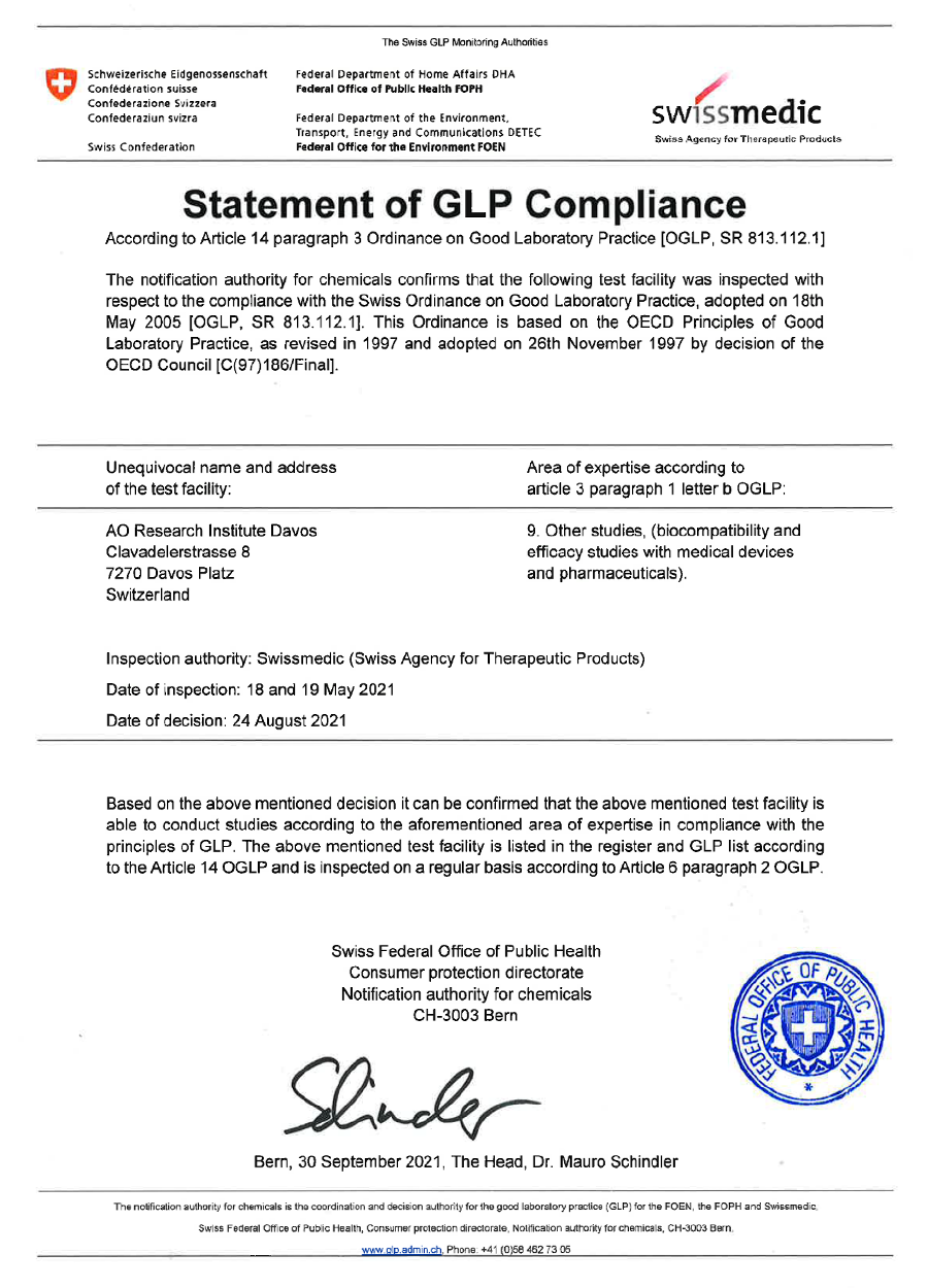 High-quality work is important for successful research. AO Research Institute Davos works hard to ensure the highest quality in all our research projects. Therefore, we are very proud to have received the official Statement of GLP Compliance from the Federal Office of Public Health, of the Swiss Confederation through Swissmedic (Swiss Agency for Therapeutic products), together representing the Swiss GLP monitoring authorities, in October 2018. AO Research Institute Davos is one of only two academic institutes certified for GLP in Switzerland.