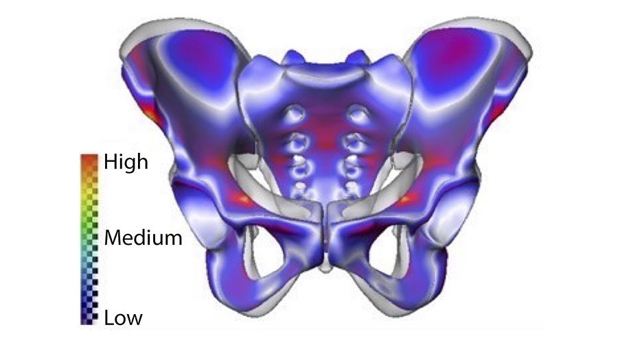 Comparison between mean Asian male (grey transparent) and female (colored) pelvic bone models