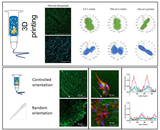 Osteochondral defects are still a major clinical challenge. They represent a large societal burden as they limit employment and impede daily life activities of millions of Europeans. Moreover, these injuries often lead to further degeneration of the joint, into a disabling disease known as osteoarthritis (OA). The defect bridges two major tissue types (cartilage and bone) that also have zonal structures within and specific healing capacities. Additionally, the cartilaginous surface must follow the patient specific contour of the surrounding tissue to avoid arthritic changes. In this project we bring together expertise in biomaterials and bioprinting to develop an additive manufacturing approach to produce constructs with precisely controlled internal architecture and the potential for patient specific implants. We are systematically investigating how to create collagen fibrils with controlled orientation within a hyaluronic acid-based matrix, thereby imitating the natural tissue composition. The possibility of printing matrix components with control over microscopic alignment brings biofabrication one step closer to capturing the complexity in animal tissues, opening new possibilities for clinical translation.