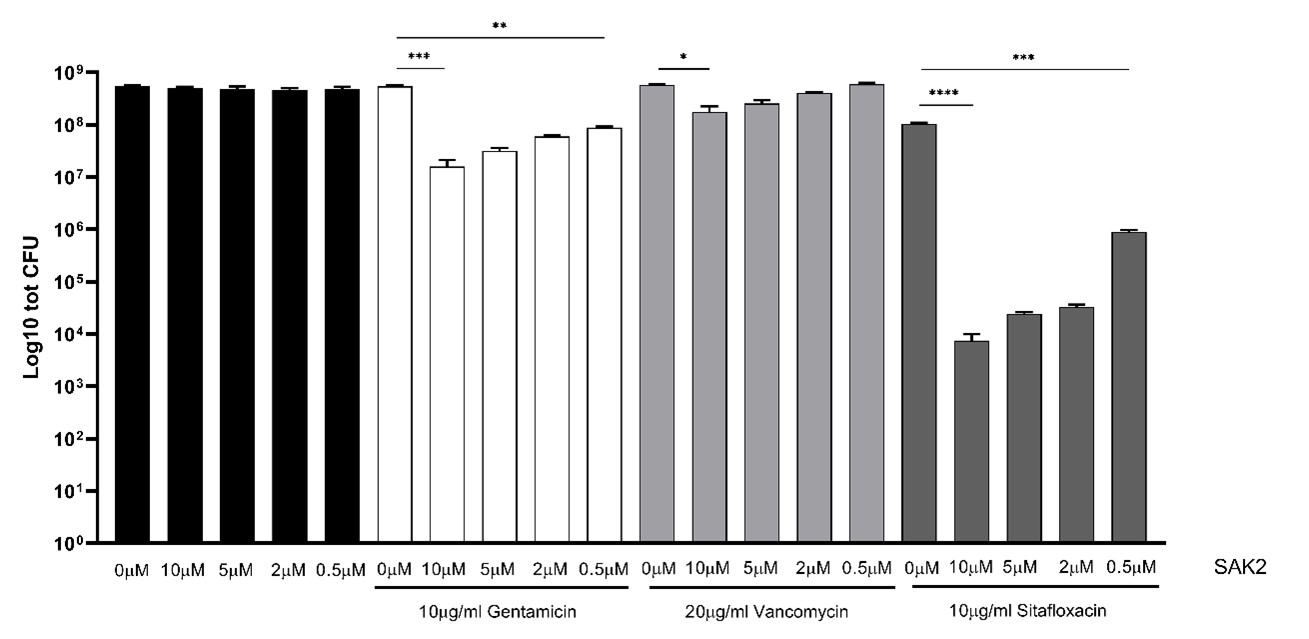 Staphylokinase (SAK2) treatment in association with antibiotics shows a higher reduction on the final CFU quantification when compared to antibiotics only. Further investigations are ongoing to evaluate whether different enzybiotics can be combined for the treatment of an infection into a mouse model.