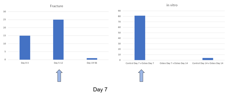 Serum was obtained from patients at various times after injury day 0-3, day 5-12 and day 19-56 and whole non-coding RNA was sequenced. As a comparator, mesenchymal stromal cells (MSCs) were induced to undergo osteogenesis and compared to unstimulated controls. We have identified several miRNA targets that are regulated during early osteogenesis. We also identified the presence of some of these markers in serum taken from fracture patients within days after fracture (Figure). Furthermore, we are also one of the first groups to identify piRNA and circular RNA markers of osteogenesis. This work will be continued in a new follow up project.