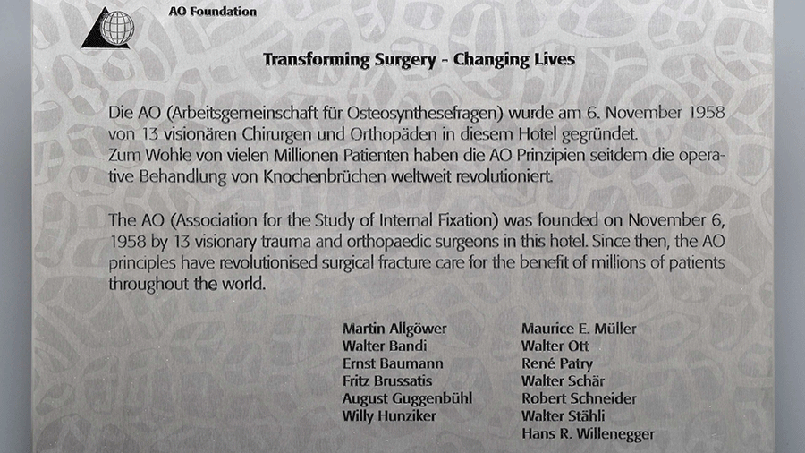 On the evening before the annual assembly of the Swiss Society for Trauma and Occupational Diseases (SGUB), of which Baumann was president, a group of surgeon friends, including Baumann, met at the Hotel Elite in Biel, Switzerland, to officially found the Association for the Study of Internal Fixation, known today as the AO.