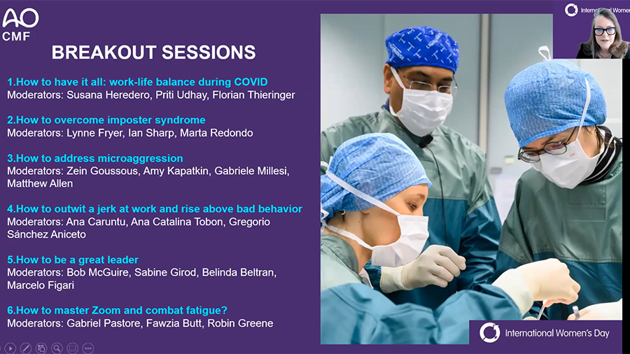 In collaboration with AO Access , AO CMF Women Surgeons Group celebrated International Women's Day 2021 with an interactive Zoom session promoting cross-gender discussions around highly topical questions of high relevance to all surgeons.