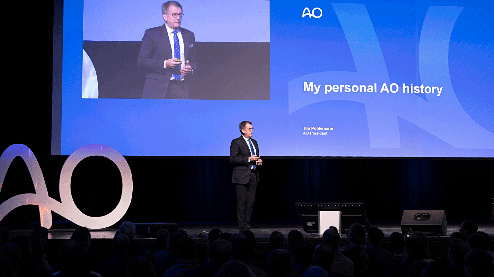Along with sharing the genesis of his engagement with the AO, Pohlemann walked the audience through the AO’s beginnings and subsequent international impact, detailing how in 1958, 13 surgeons banded together in Switzerland as the Arbeitsgemeinschaft für Osteosynthesefragen (Association for the Study of Internal Fixation and Fractures, or AO) to revolutionize the treatment of musculoskeletal disorders, championing the AO’s principles of fracture management: fracture realignment, fracture fixation, soft-tissue preservation, and early mobilization. Pohlemann described how the basis of the AO’s success was through identifying a clinical problem, followed by a technical solution, and delivering proof of concept—a model that was then introduced through education and still is today, 65 years later.
