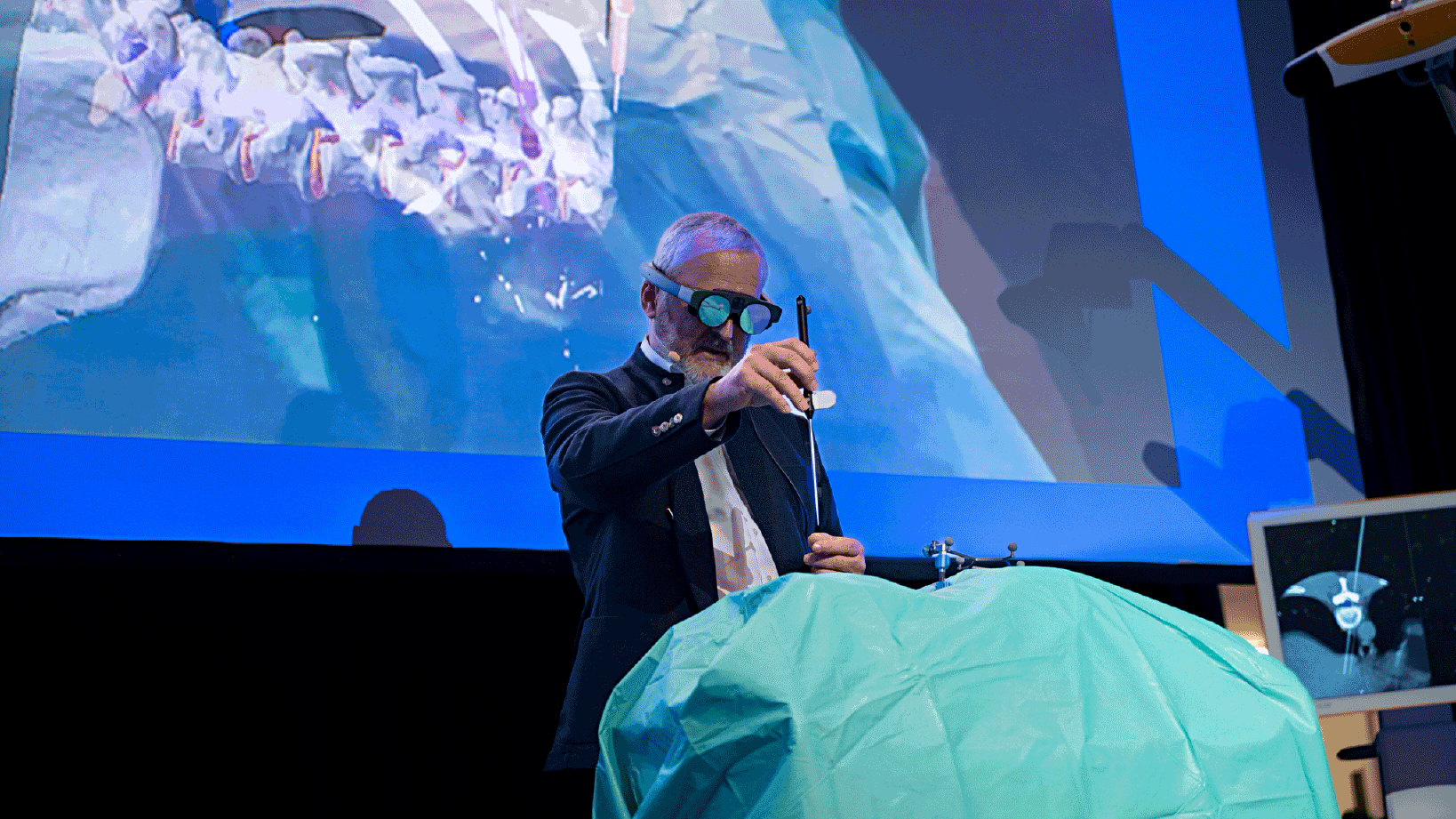 Donning a pair of VR goggles, Gebhard emphasized his vision of the digital future of surgical education, demonstrating a visualization of a spine surgery, one of many offerings available in cooperation with the AO’s industrial partner, Brainlab.